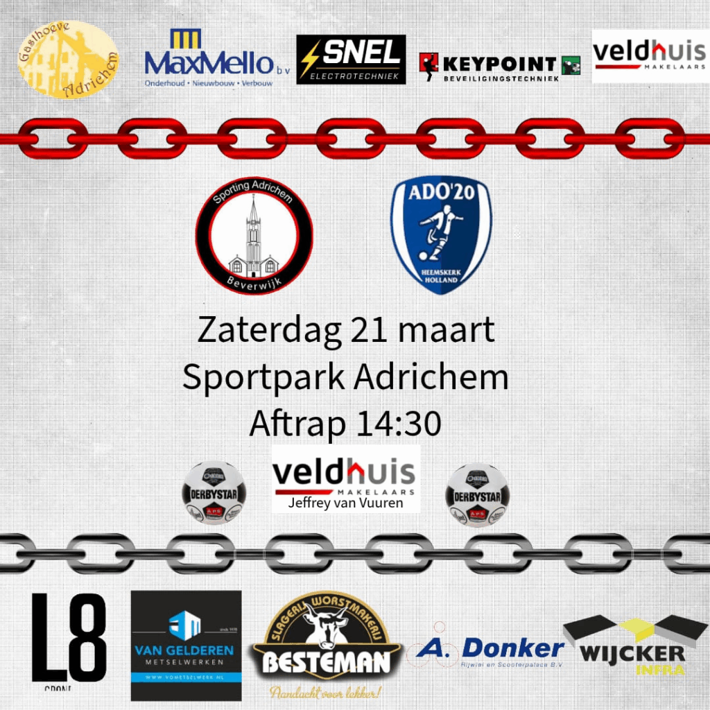 Maar daar niet teveel in blijven hangen, de uitwedstrijd bij ADO’20 was lastig genoeg, eigenlijk gaven we daar een best wel mooie voorsprong uit handen door wat slordig spel in de laatste fase.